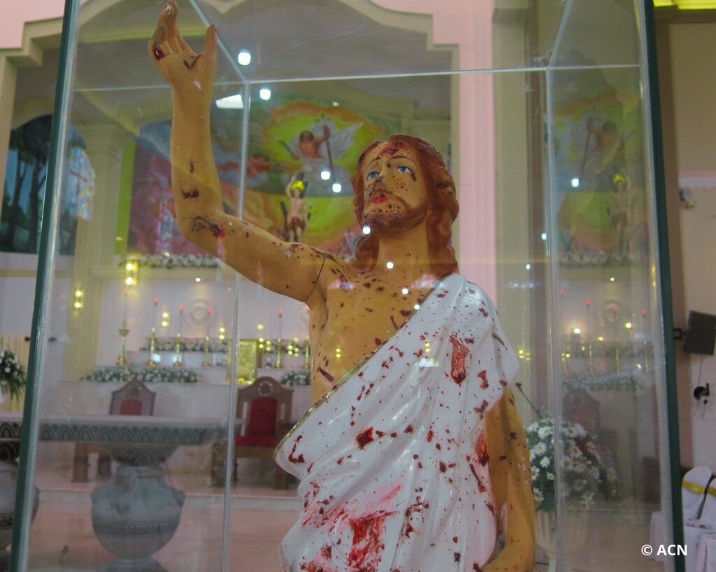 Sri Lanka – Preserved under a glass shrine, this statue of the Risen Christ will forever bear the blood of the martyrs of St. Sebastian’s Church in Negombo. On April 21, 2019, Easter Sunday, eight attacks killed 279 people. Of these, 200 were officially declared martyrs by the Commission.