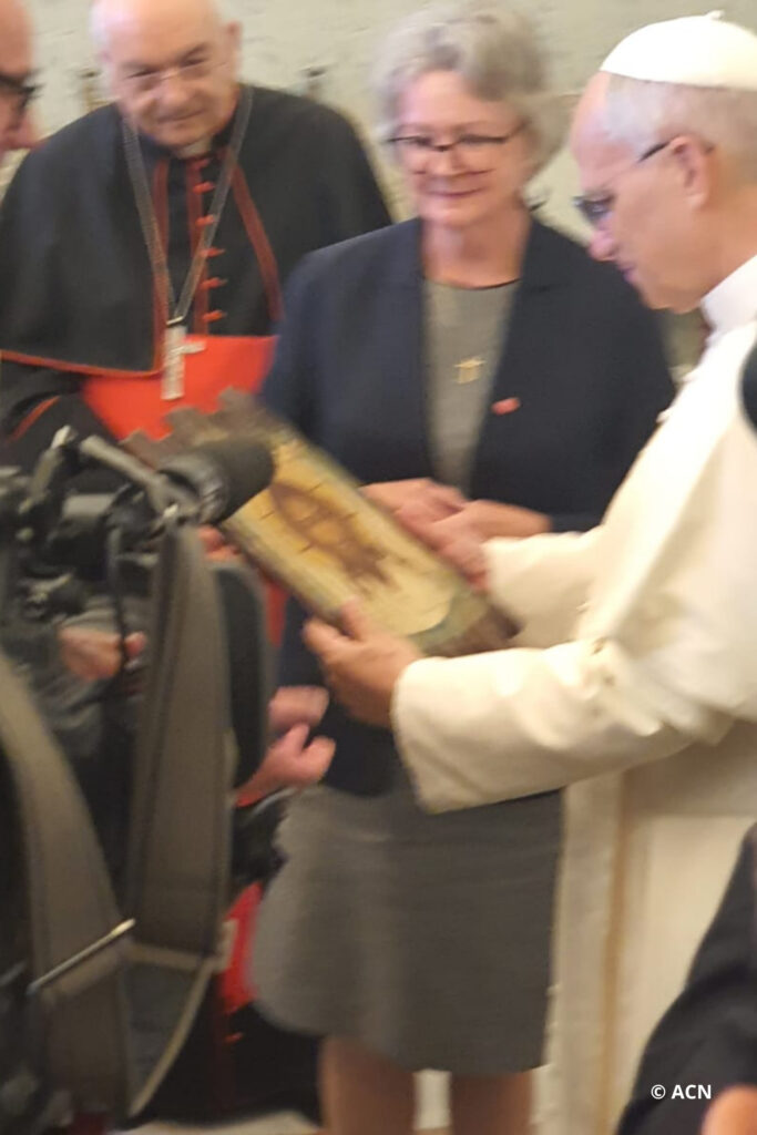 As a symbol of hope and faith enduring through suffering, Regina Lynch presented the Holy Father with an icon made from the wood of the destroyed ceiling of the Maronite Cathedral of Saint Elias in Aleppo. The cathedral, severely damaged during the conflict in Syria, was later restored with the support of Aid to the Church in Need and reopened on July 20, 2020, the feast of its patron saint.